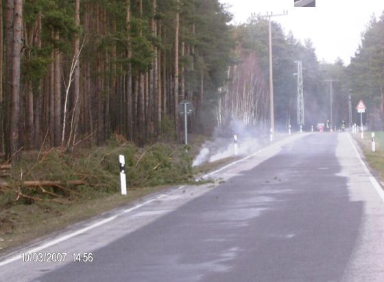 Bei Baumfällarbeiten Baum in 10 KV - Leitung gefallen. Leitung zerrissen und Waldbodebbrand