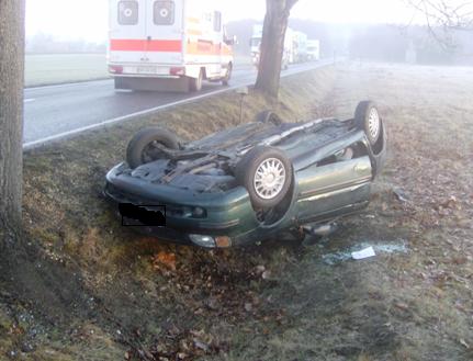 streifte einen Baum und überschlug sich , das Fahrzeug blied anschließend auf dem Bach liegen.