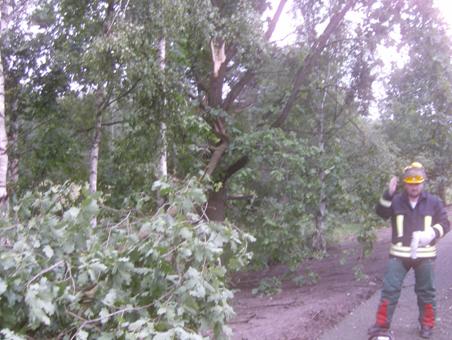 der Ast zersägt und die Straße beräumt anschließend konnte die Straße wieder frei gegeben werden.